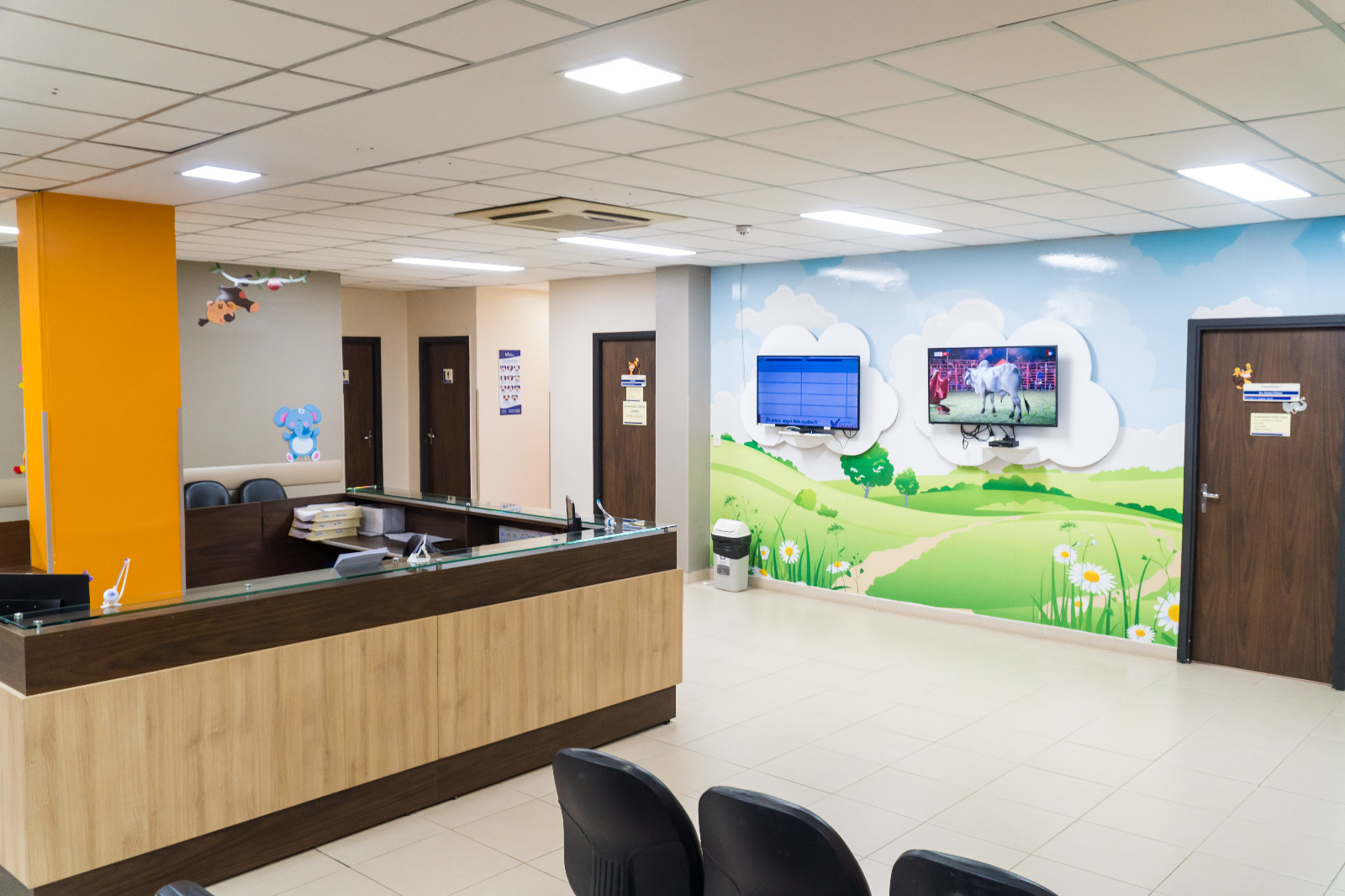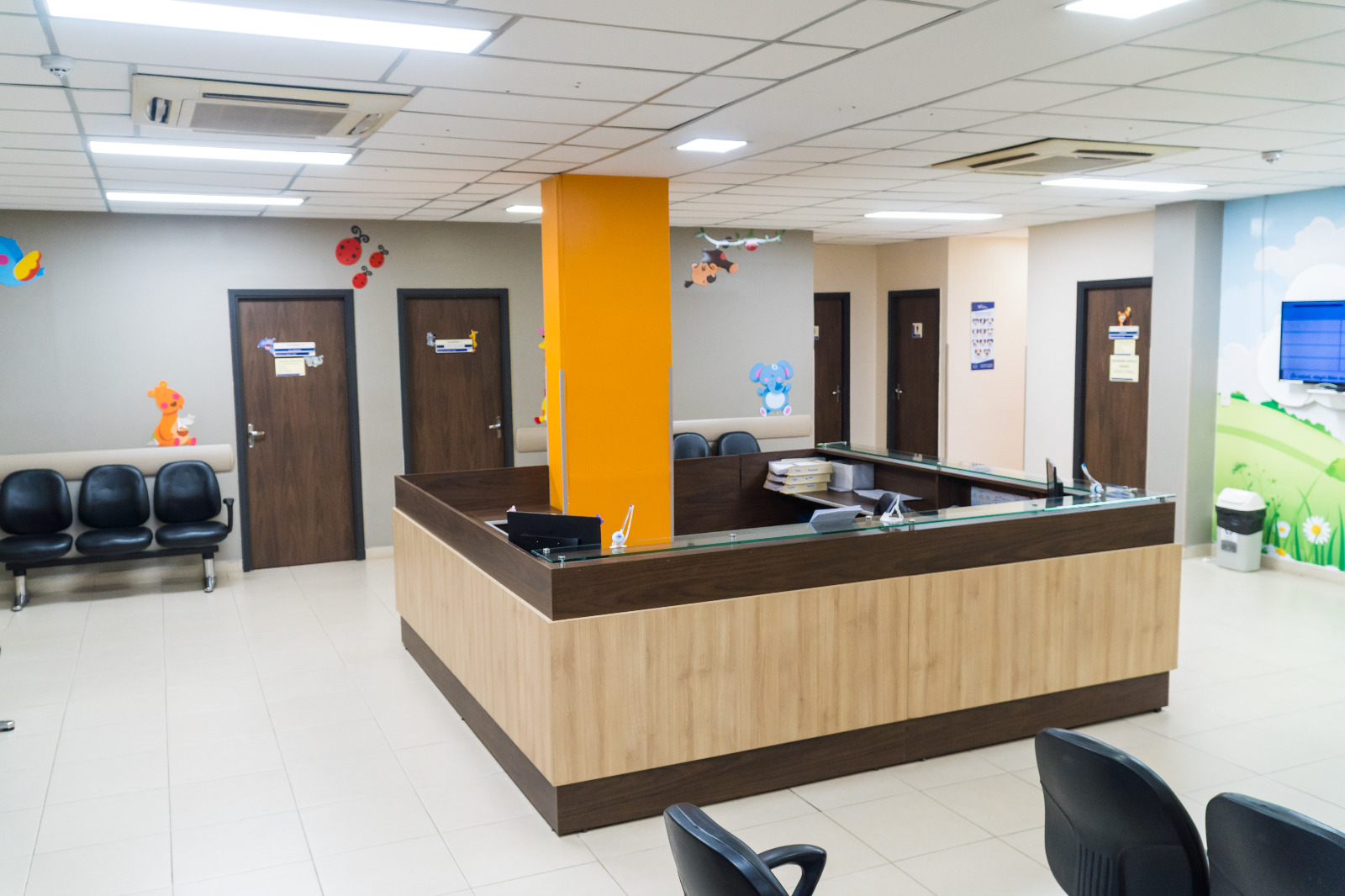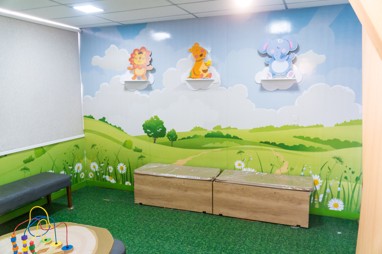 Para hacer más amena y distendida la espera a consulta de pacientes en edad pediátrica, se ha ideado un ambiente propicio reuniendo los 7 consultorios, con una sala con motivos infantiles y dotados de juegos.